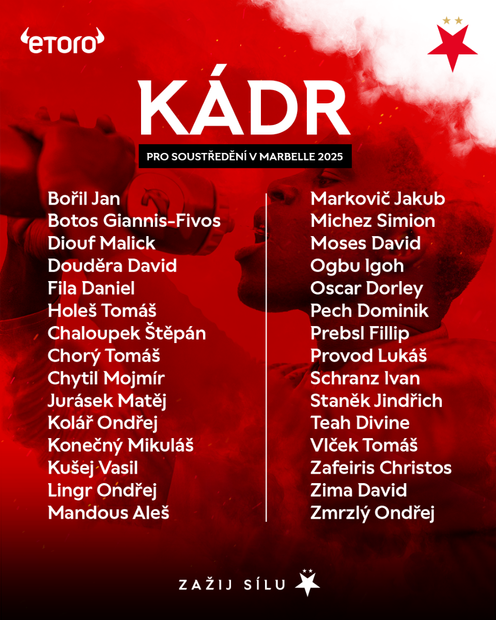 Naopak soustředění s A-týmem v Marbelle zahájí i nejčerstvější posily. Čtyřiadvacetiletý křídelník Vasil Kušej, který do Slavie přestoupil z Mladé Boleslavi, a brankář Jakub Markovič. Ten se do Edenu vrátil z Baníku Ostrava. A do Španělska letí třeba i Matěj Jurásek, u něhož se Slavia podle mediálních spekulací nebrání přestupu a má se o něj zajímat třeba Norwich z druhé anglické ligy.