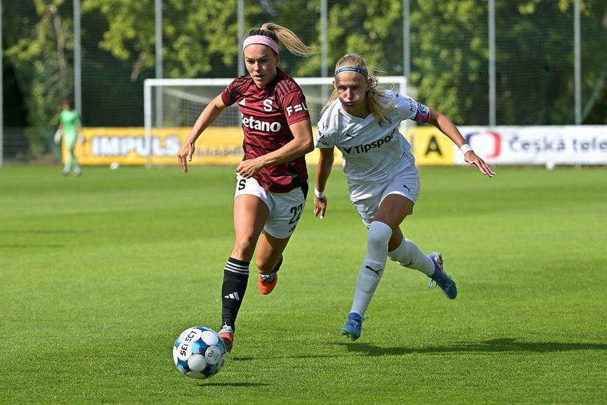 Nová sparťanská naděje Hallie Bergford měla ke gólu blízko, tentokrát ale vyšla naprázdno. Sparťanky jsou sice oproti slávistkám gólově skromnější, bodově ale drží krok – dva zápasy, dvě výhry. A navíc vychytaná nula pro mladičkou brankářku Nikolu Harantovou. Další jméno, které si zapamatujte.