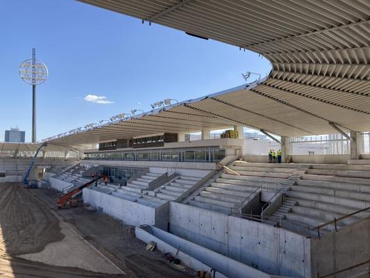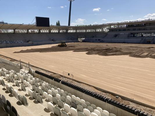 Nový stadion v Hradci Králové pro 9300 lidí směřuje ke svému dokončení. Ochozy se plní sedačkami, na hrací plochu se naváží zemina, na střechách tribun jsou namontovaná světla. Práce poskočily v interiéru i na parkovišti.