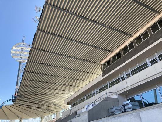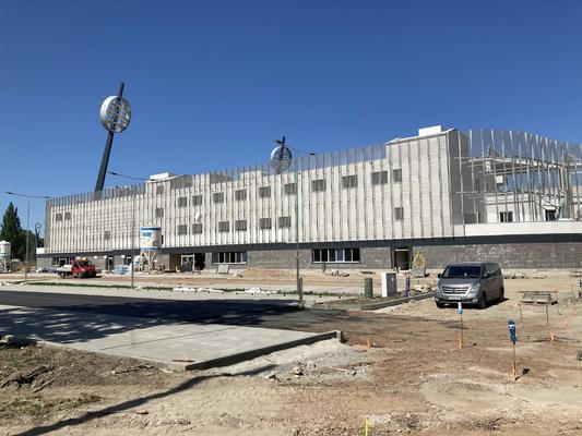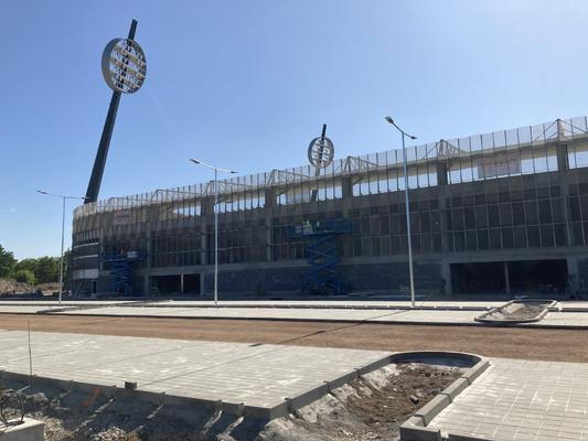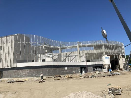 Aréna také dostala nový plášť. „Opláštění je zhruba ze tří čtvrtin hotové. Doděláváme pár stavebních detailů na fasádách. Pokročili jsme na parkovišti, kde pracujeme na komunikacích. Na jihu a západě jsou zámkové dlažby hotové, na východě už je také dokončujeme, částečně už jsme dělali i asfalt, další etapa bude probíhat hned zkraje června,“ říká manažer stavby.