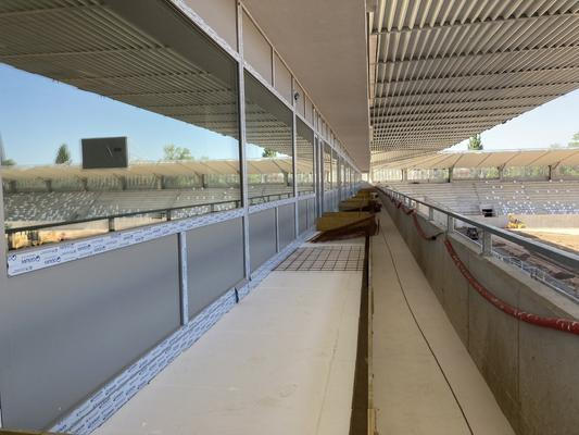 Pokrok je patrný také v interiéru, zejména v hlavní tribuně. „V horním patře už děláme marmolea, pokládáme koberce, provádíme malby, nasazujeme dveře. Obklady jsou ve druhém a třetím patře hotové, v prvním, kde budou mít zázemí fotbalisté, se dokončují,“ říká Novotný.