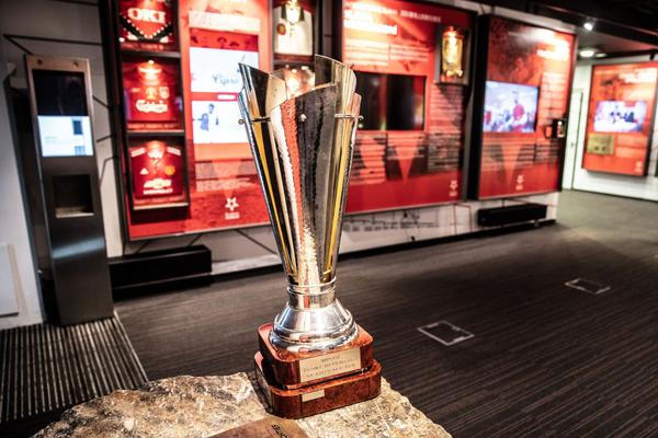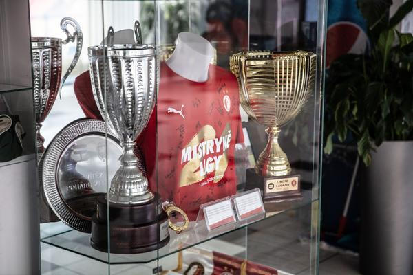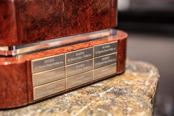 Upomínky na tuto skvostnou sezonu ženského týmu Slavie najdete také v prvním patře. Nechybí tu ani trofej nejcennější – putovní Pohár pro mistra České republiky ve fotbale žen, jak zní jeho oficiální název. Aktuálně zaujímá čestné místo vedle trofejí slavistického totálního hattricku z let 2019 až 2021.