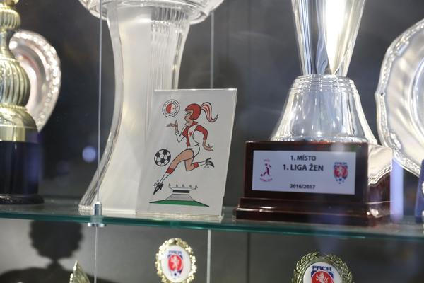 Najdete je v jedné z vitrín prvního patra. Vedle sebe zde stojí četné poháry za ligová, pohárová i mezinárodní vítězství. Vaši pozornost jistě upoutá drobná karikatura slávistky v tradičním dresu a s koňským ohonem svázaným gumičkou, dodnes jednoho z nejčastějších účesů fotbalistek. Její ženskost je zde podtržena tím, že kopačky mají přimalovány podpatky.