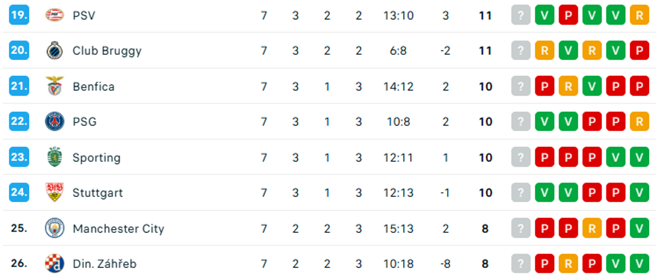 Výkus tabulky kolem posledního postupového 24. místa ukazuje všech osm týmů, které před posledním kolem ještě nemají jistou situaci a hrají dnes večer o postup. Přímá bitva o něj je na programu také ve Stuttgartu, kam přijede PSG.