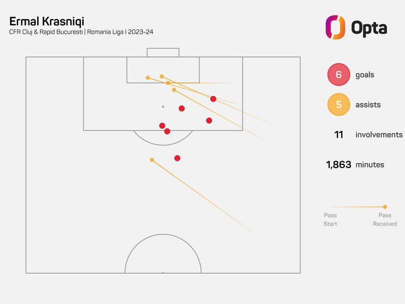 Ermal Krasniqi – data z rumunské Ligy I 2023/24 a Chance ligy 2024/25 |