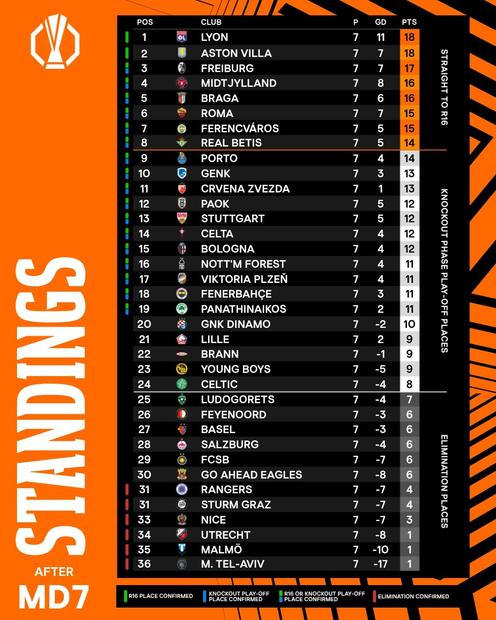 To ale hodně předbíháme. Střed ligové tabulky je hodně nahuštěný a Viktoria s ohledem na čtvrteční výsledky (všech 18 zápasů se hraje ve stejný čas a tabulka se tak bude v čase zajímavě přelévat) může skončit teoreticky osmá a zajistit si přímou účast v osmifinále (muselo by se ale sejít velké množství dalších výsledků včetně například remízy mezi CZ Bělehrad a Celtou Vigo a sama Viktoria k tomu nutně musí ve Švýcarsku vyhrát), ale klidně také teoreticky může klesnout až na 24. pozici. Oba extrémy jsou velmi nepravděpodobné, ale teoreticky na ně dojít může.