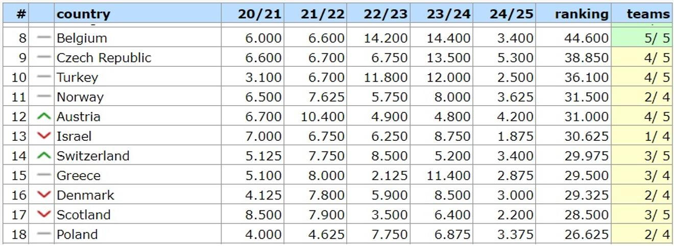 Česko do této sezony vstupovalo v aktuálním počítání národního koeficientu na desátém místě. Mezitím, jak už jsme psali, se výbornými výsledky všech českých klubů v předkolech dostalo před Turecko a je tak teď deváté. Na osmé místo Belgie pomýšlet nemůžeme, s náskokem kolem sedmi bodů a stále s pěti týmy v evropských soutěžích je hodně daleko.