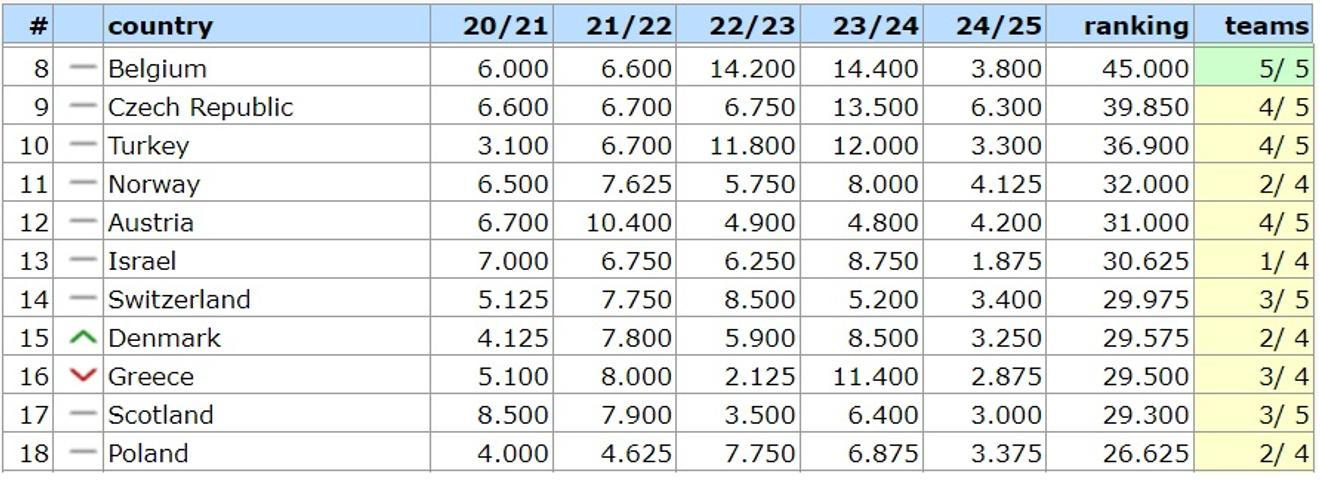 „Kromě zmíněných odstupů od Belgie a Turecka je samozřejmě vůbec nejdůležitější náskok 7,850 bodu na jedenácté Norsko. Mistr příští ligové sezony půjde téměř jistě přímo do LM 2026/27,“ uvádí FC Koeficient.