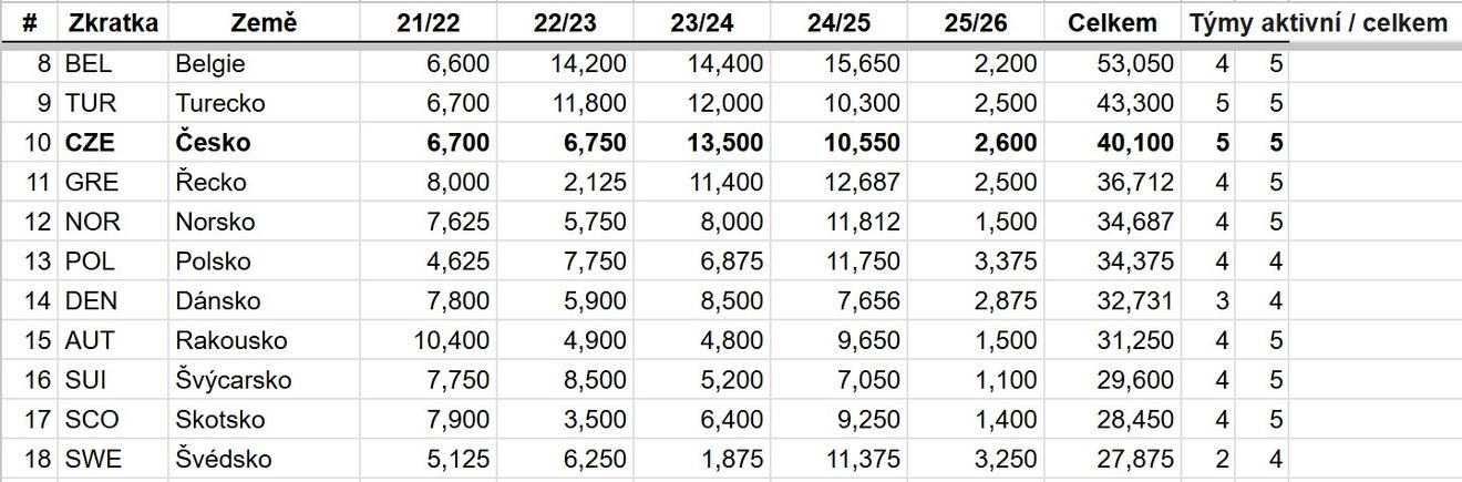 Připomeňme, že právě na desátém místě v aktuálním počítání koeficientů Česko do sezony vstupovalo a bezpečně si ho zatím drží.