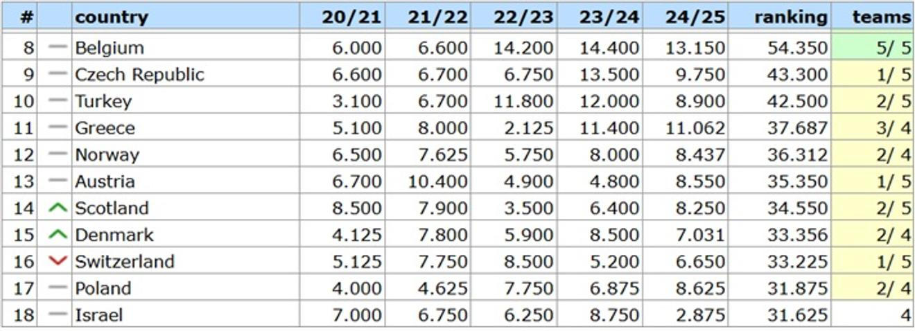 Připomeňme také, že žebříček národních koeficientů počítaný v aktuální sezoně bude platit pro nasazení klubů do pohárové Evropy v sezoně 2026/27.