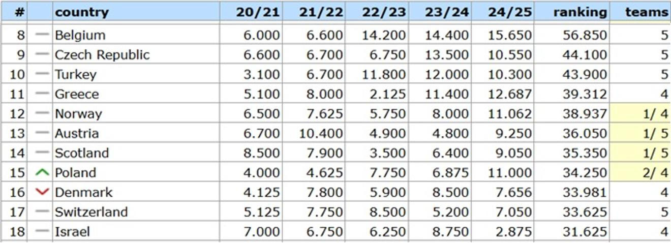 „Za pozornost stojí, že většinu bodů (5,300) Česko uhrálo tuto sezónu v předkolech, zatímco v ligových fázích a s přičtením bonusových bodů za umístění to bylo jen 5,250 bodu,“ dodává FC Koeficient.