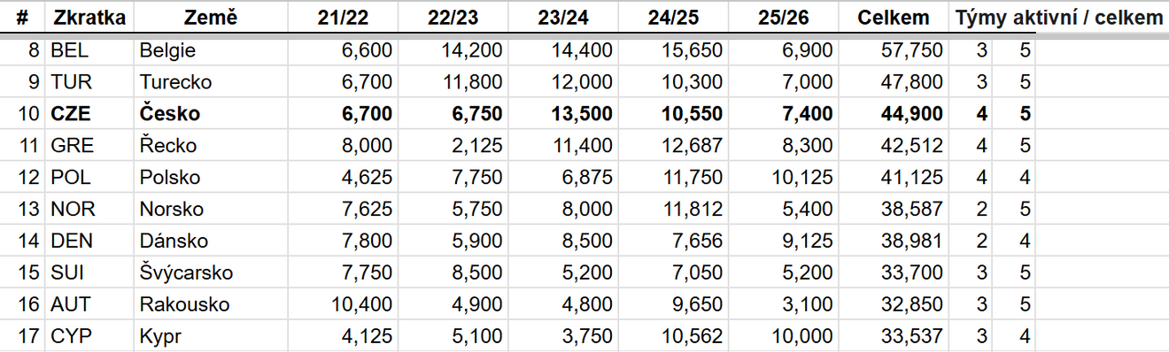 Připomeňme, že Polsko má na rozdíl od Turecka, Česka i Řecka jako jediné v boji o top desítku výhodu, že své zisky dělí čtyřmi týmy v pohárech v této sezoně, a ne pěti jako zbylá trojka. Zatímco Česko, Turecko a Řecko tak za výhru píší 0,4 bodu a 0,2 bodu za remízu, u Polska je to 0,5 a 0,25 bodu.