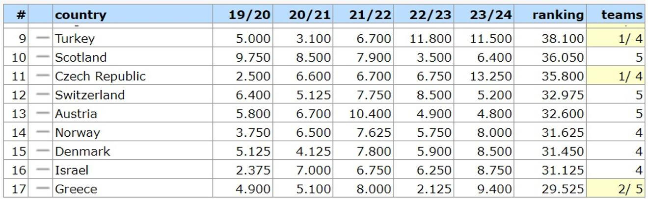 Země za aktuálně jedenáctým Českem mají velký odstup a jejich zástupci už z Evropy vypadli.