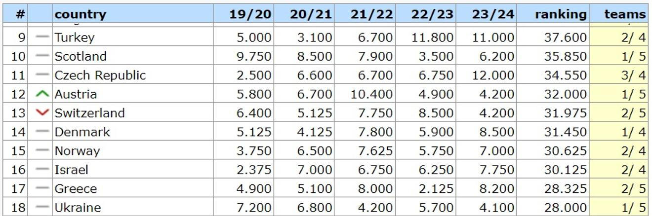 Švýcarsko po včerejší prohře Young Boys doma se Sportingem Lisabon 1:3 v Evropské lize a domácí remíze Servette Ženeva s Ludogorcem 0:0 spadlo na třinácté místo těsně za Rakousko, protože Sturm Graz získal 0,400 bodu pro svou zemi za výhru nad Slovanem Bratislava. Obě země jsou ale za Českem o víc jak 2,5 bodu a už nemají ve hře další týmy. Jejich šance na přeskočení Česka v aktuálním žebříčku, který bude rozhodovat o nasazení týmů do sezony 2025/26 je tak spíš teoretická. Například pro Rakousko platí, že by musel Sturm Graz dojít do finále Konferenční ligy a české kluby neuhrát ani bod.