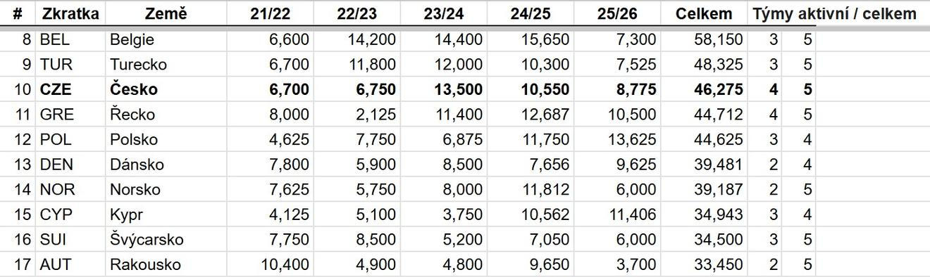 Připomeňme, že Polsko má na rozdíl od Turecka, Česka i Řecka jako jediné v boji o top desítku výhodu, že své zisky dělí čtyřmi týmy v pohárech v této sezoně, a ne pěti jako zbylá trojka. Zatímco Česko, Turecko a Řecko tak za výhru píší 0,4 bodu a 0,2 bodu za remízu, u Polska je to 0,5 a 0,25 bodu.