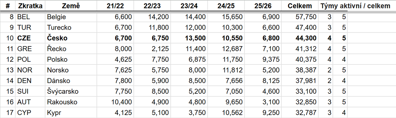 Právě s třemi zmíněnými zeměmi je Česko v této sezoně v napínavé bitvě o udržení pozice v top desítce, která zaručuje jistou účast národního šampiona v Lize mistrů.