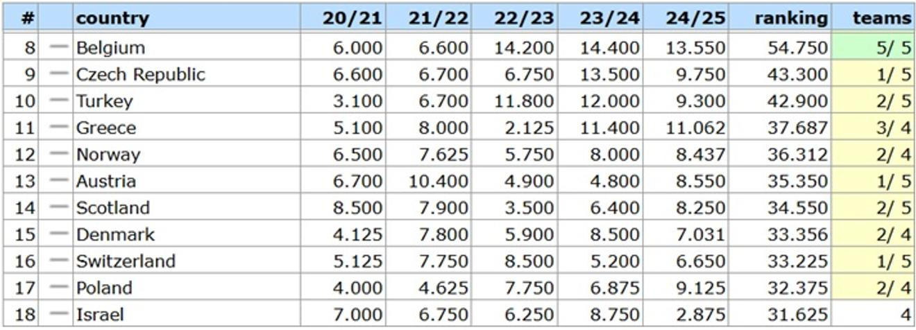 Připomeňme také, že žebříček národních koeficientů počítaný v aktuální sezoně bude platit pro nasazení klubů do pohárové Evropy v sezoně 2026/27.
