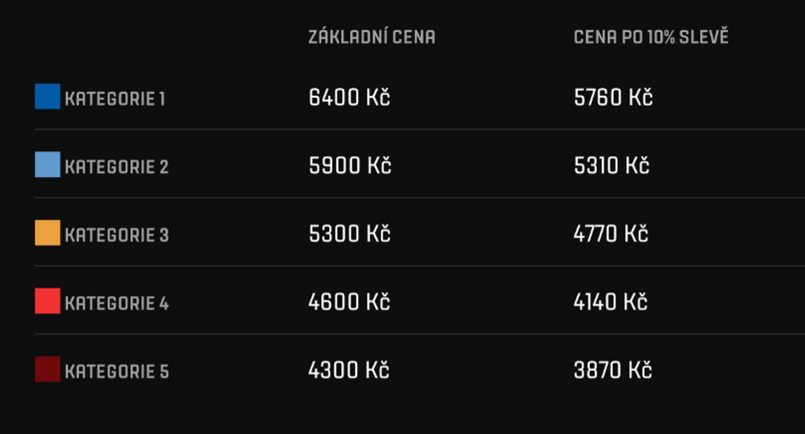 Základní cena permanentek zůstane v rozpětí od 4300 do 6400 korun. Nezmění se pro ty, kdo si vyberou z první (6400 Kč), třetí (5300 Kč) nebo páté (4300 Kč) cenové skupiny pro příští sezonu. Tyto nové cenové kategorie odpovídají třem jediným, které platí ještě v aktuální sezoně.
