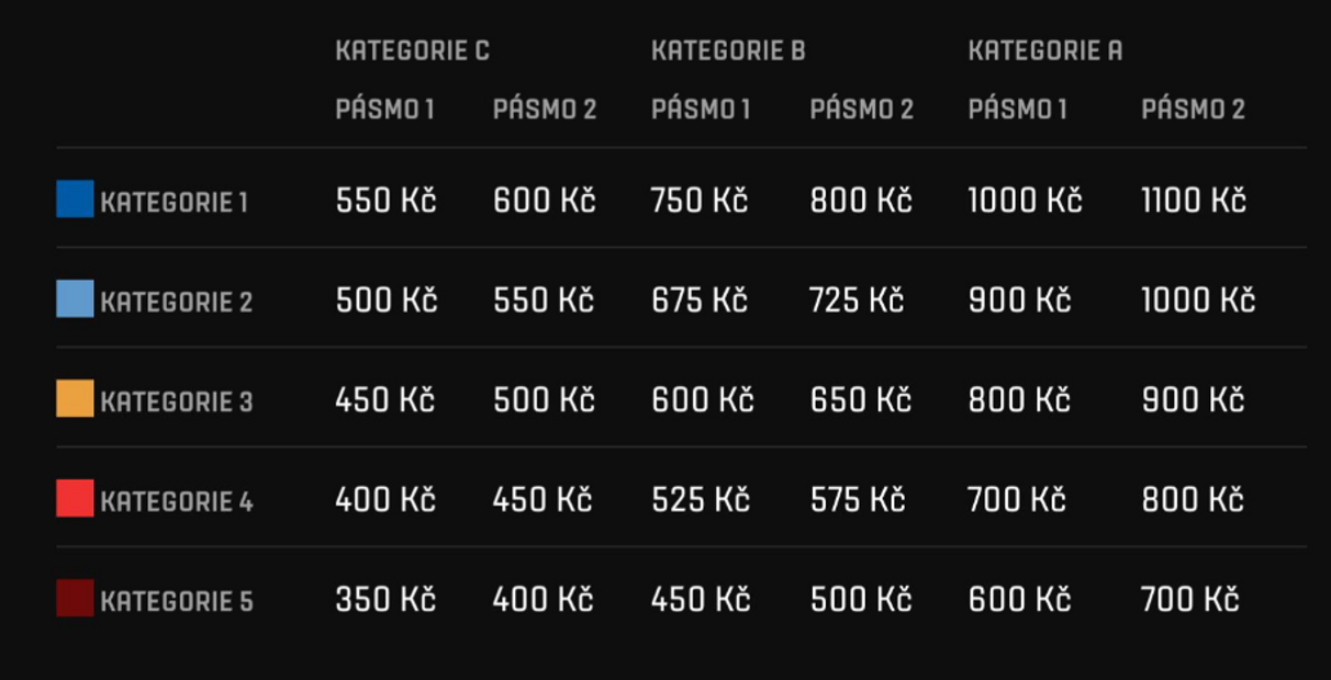 Kromě nich nově vznikne druhá (5900 Kč) a čtvrtá cenová kategorie (4600 Kč).