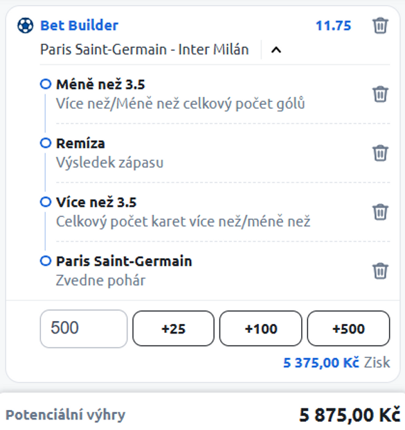 Náš verdikt: Tenhle zápas půjde do prodloužení. A rozhodně v základní hrací době padne méně než 3,5 gólu. Pevná a nepříjemná defenziva Interu povede k tomu, že uvidíme víc než 3,5 karet. V nastavení nebo penaltách pak podle nás ale bude nakonec přeci jen šťastnější favorizovaná Paříž, která tak ukončí své čekání na ušatý pohár! Sázková kancelář Betano na tenhle BetBuilder vypsala kurz 11,75. Máme se na co těšit!