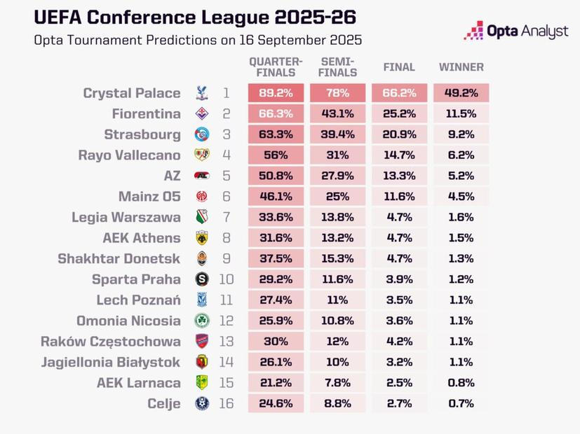 Data ani pohled na možné soupeře Spartě ale velké šance na finále nedávají. Například predikce společnosti Opta říká, že letenští jsou až desátí největší favorité na výhru celé Konferenční ligy. Konkrétně Opta na celkové vítězství dává Spartě šanci ve výši 1,2 % a účast ve finále jí věří jen na 3,9 %. Sigma je podle Opty s nulovou šancí a mezi top šestnáctkou největších favoritů není podle ní ani Plzeň v Evropské lize.