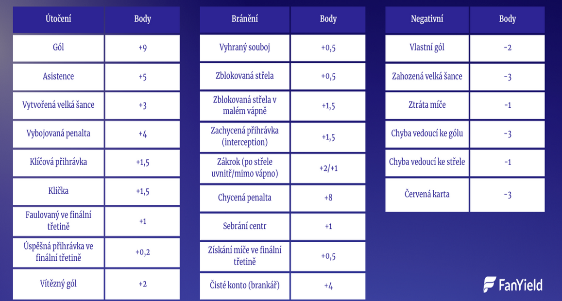 Česká platforma FanYield nabízí fantasy turnaje, které jdou za hranici klasiky typu „gól + asistence = body“. Boduje se každý důležitý moment na hřišti – od zblokovaných střel, přes chycené penalty až po klíčové přihrávky ve finální třetině.