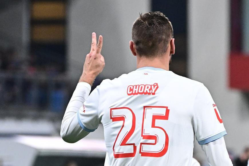 Slavia v utkání velmi efektivně využívala momenty, kdy se dostala k dlouhým nákopům na Chorého. Její hráči na ně byli připraveni dobře načasovanými náběhy, které směřovaly za záda vysokého útočníka, a ten na ně prodlužoval míč. Ještě o něco efektivnější strategií v tomto utkání však bylo jeho sklepávání.