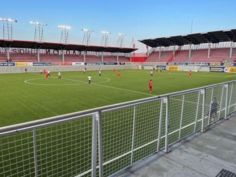 Zápas už pár minut běží a my si konečně sedáme na jedinou otevřenou tribunu. Divácká účast není vysoká, takových 500 lidí. Na Stadionu pro 5000 tak nemá cenu otevírat další tři tribuny. Pouze na kraj jedné z nich pouští pořadatelé asi 20 nadšenců, kteří fandí soupeři.