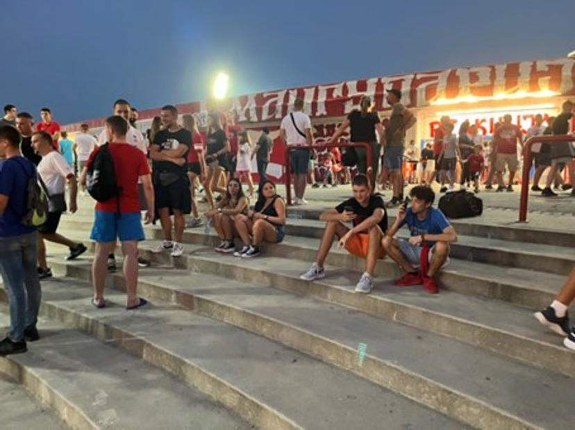 Po chvilce přichází pořadatel, s někým telefonuje a říká nám, ať počkáme, že nás dovede na místa včas. V době výkopu se naše skupina konečně vydává směrem k podzemnímu parkovišti nákupního centra. Od srbských fanoušků se dozvídáme, že přijeli podpořit hostující celek Čukarički, a nabízejí nám možnost jít s nimi do sektoru zdarma. S díky odmítáme.