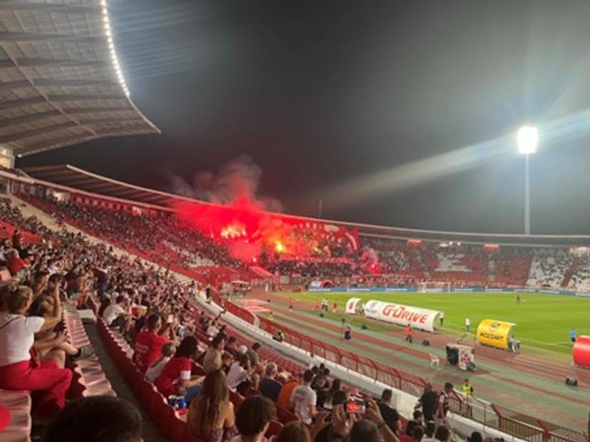 To zvedá ze sedaček i diváky okolo nás na hlavní tribuně. Ti si jinak většinu času povídají a jedním okem sledují fotbal. Do aktivního fandění se nezapojují. Kotel Zvezdy naopak od samého začátku jede naplno a zhruba pět tisíc nadšenců vytváří poměrně slušnou atmosféru. Na obrovském stadionu bohužel jejich skandování rychle zaniká. Svůj tým ale podporují bez přerušení po celou dobu utkání. Někdy v 10. minutě se pak objevuje první světlice a prakticky bez přestávky v kotli hoří aspoň jeden kus pyrotechniky až do konce zápasu.
