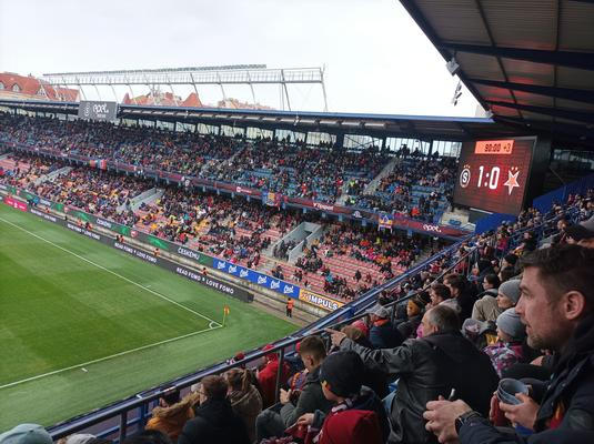 Sparta při prodeji lístků vsadila, jak už to u podobných akcích bývá, na koncentraci fanoušků na jednom místě – v tomto případě na protilehlou tribunu a tribunu za bránou, kde sedíme i my. Podle letmého pohledu tipuji návštěvu šest až sedm tisíc diváků. V publiku je hodně dětí a pro mě možná trochu překvapivě (zejména na základě zkušeností s mojí sparťanskou bandou) také dost permanentkářů.