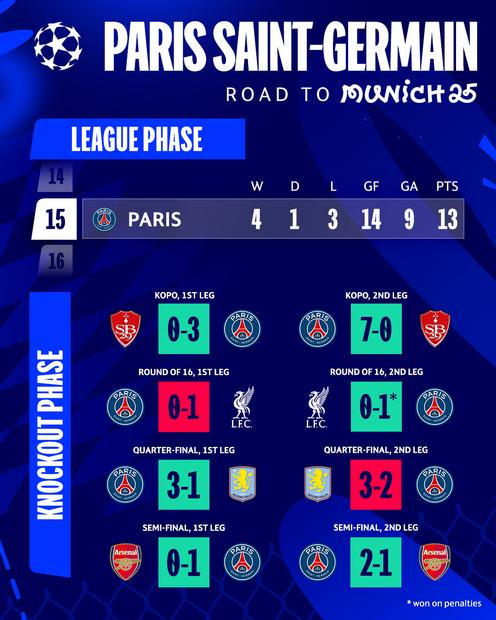 Pařížané hráli až do konce ligové fáze o postup mezi top 24 a jednu chvíli to vypadalo, že k vyřazovací části mají daleko. Pak ale porazili v předposledním kole základní části Manchester City 4:2 a jejich sezona v Lize mistrů se úplně obrátila. V play off postupně vyřadili Brest, Liverpool, Aston Villu a Arsenal a v sobotu večer budou hrát o svůj vysněný první celkový triumf v Champions League.
