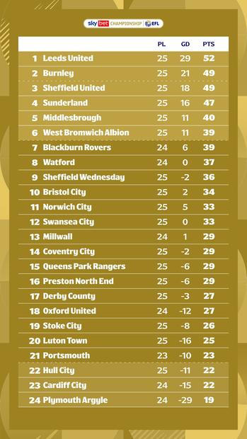 Ve hře o dvě přímá postupová místa jsou aktuálně nejvýrazněji čtyři kluby – první Leeds má 52 bodů, druhé Burnley a třetí Sheffield United jsou na 49 bodech a čtvrtý Sunderland má 47 bodů. První tři týmy jsou sestupivší z Premier League v minulých dvou sezonách.
