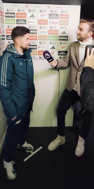 Ta pravá „zábava“ ale začíná po zápase. Natáčím spokojené fanoušky domácích po výhře Arsenalu 3:1 a přesouvám se k rozhovorovým budkám. Celé odpoledne mi je oporou zkušený reportér izraelské televize Sport 1 Niv Dovrat. Na tento zápas přijelo 22 vysílatelů z celého světa. Je jasné, že o hvězdné hráče bude boj. Koho dostaneme na rozhovor zrovna my, je vždy na produkci Premier League. Jak k danému jménu dojde? To nikdo neví. „Canal+ Sport CZ/SK? Jorginho!“ Skvělý, pomyslím si. Muž zápasu. Kolega Niv Dovrat z Izraele ho shodou okolností dostal taky. Čekáme spolu.